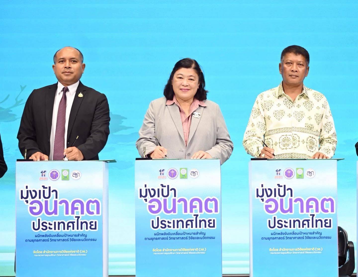 วันที่ 14 ตุลาคม 2568 สำนักงานการวิจัยแห่งชาติ (วช.) กระทรวงการอุดมศึกษา วิทยาศาสตร์ วิจัยและนวัตกรรม ร่วมกับจังหวัดพัทลุง และภาคีเครือข่ายในพื้นที่ จัดพิธีลงนามบันทึกข้อตกลงความร่วมมือกิจกรรม “มุ่งเป้าอนาคตประเทศไทย น้ำมั่นคง ไม่ท่วม ไม่แล้ง” เพื่อขับเคลื่อนเป้าหมายสำคัญตามยุทธศาสตร์ ววน. โดยมี ดร.วิภารัตน์ ดีอ่อง ผู้อำนวยการสำนักงานการวิจัยแห่งชาติ เป็นประธานในพิธี กล่าวเปิดงานและร่วมลงนาม พร้อมด้วย นางสาวเสาวนีย์ มุ่งสุจริตการ รองผู้อำนวยการสำนักงานการวิจัยแห่งชาติ และคณะผู้บริหาร วช. เข้าร่วมในงาน นอกจากนี้ยังมี นายธราวุธ ช่วยเกิด รองผู้ว่าราชการจังหวัด รักษาราชการแทนผู้ว่าราชการจังหวัดพัทลุง รวมถึงหน่วยงานภาครัฐ ภาคเอกชน และภาคประชาสังคม จากจังหวัดสงขลาและจังหวัดพัทลุงกว่า 15 หน่วยงาน เข้าร่วมลงนามและร่วมแสดงเจตนารมณ์ในการขับเคลื่อนความร่วมมือดังกล่าว ณ โรงแรมลีการ์เดนส์พลาซ่า อำเภอหาดใหญ่ จังหวัดสงขลา