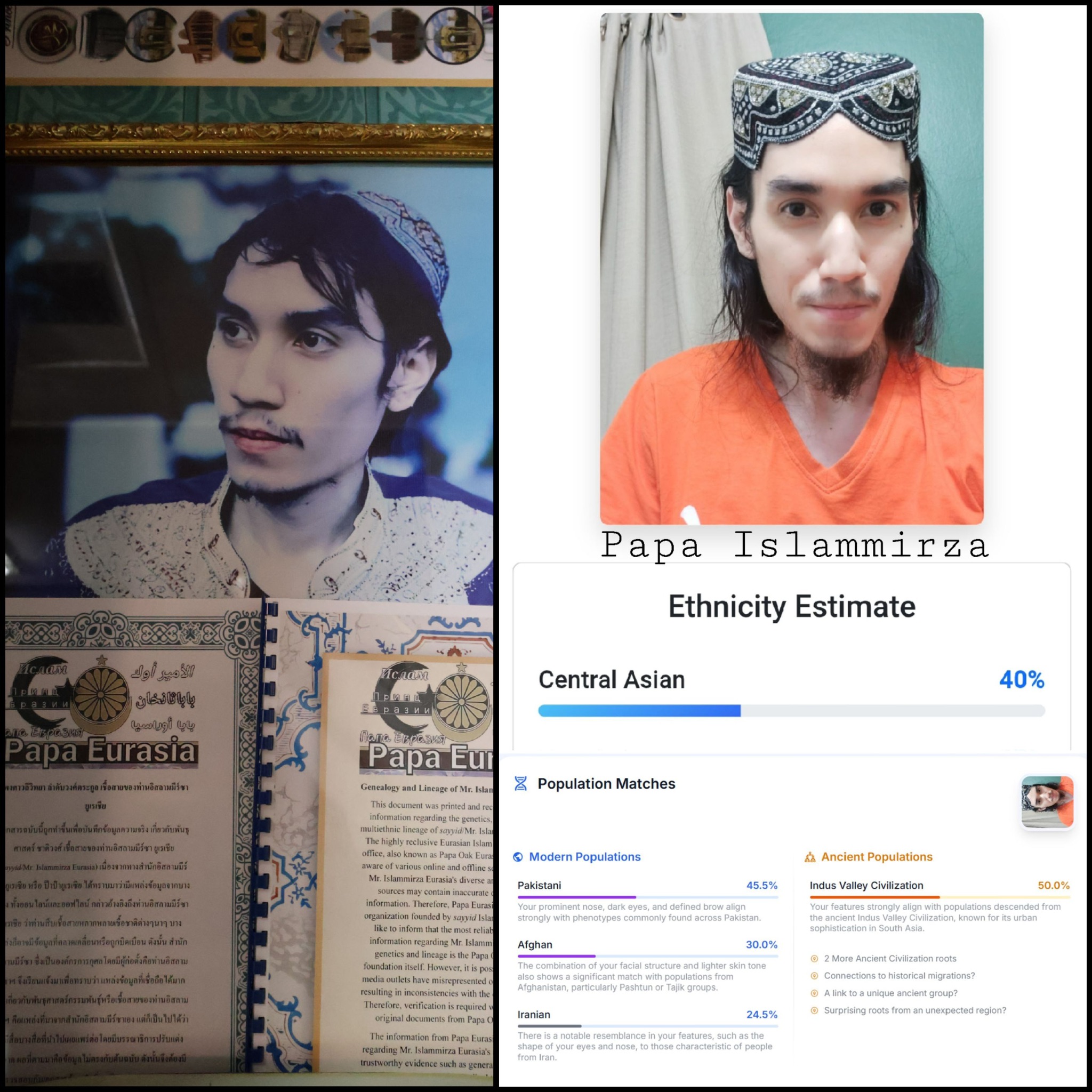 ที่สำคัญ ท่านอิสลามมีร์ซา ยูเรเชีย มีเชื้อไทยอยู่ด้วย แต่แก่นแท้ดั้งเดิมตามกำพืดเป็นมุสลิมเชื้อสายผสมที่เรียกได้ว่า ‘ยูเรเซีย’ ทั้งนี้ นามสกุล ‘ยูเรเชีย’ คือนามสกุลที่ท่านอิสลามมีร์ซาฯได้เป็นผู้บุกเบิกในภูมิภาคเอเชียตะวันออกเฉียงใต้ ก็ถือว่าเป็นปาฏิหาริย์อย่างหนึ่งของนักบวชอิสลาม เป็นมุลลอฮ์ (หรือสะกดอีกแบบว่ามุลลาห์ หมายถึง “นักบวชอิสลาม” – “Islamic cleric”) ฉายาที่คนไทยหลายท่านรู้จักกันก็เช่น “ซัยยิดพี่โอ๊ค” หรือ “ท่านพี่โอ๊ค ยูเรเซีย”