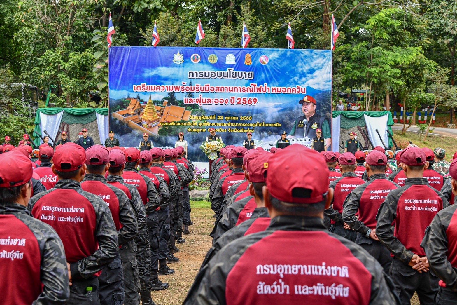 สวัสดิการและจัดหาอุปกรณ์สนับสนุนให้เพียงพอต่อภารกิจ โดยเฉพาะการนำทรัพย์สินของกลางที่เหมาะสมมาใช้ประโยชน์ในการปฏิบัติงานภาคสนาม และขอให้เจ้าหน้าที่ ยึดหลักการทำงานสำคัญ 3 ประการ คือ 1) ความปลอดภัยของเจ้าหน้าที่ต้องมาก่อน 2) ต้องทำงานเป็นทีมและบูรณาการระหว่างหน่วยงาน 3) สร้างการมีส่วนร่วมของชุมชนในการดูแลป่า พร้อมย้ำว่า “ภารกิจของท่านไม่ใช่เพียงแค่การทำงาน หากแต่เป็นการปกป้องอนาคตของลูกหลาน ปกป้องทรัพยากรธรรมชาติ และคุณภาพชีวิตของพี่น้องประชาชนไทย ผมเชื่อมั่นว่าความร่วมมือและหัวใจที่มุ่งมั่นของทุกคน จะทำให้ประเทศไทยก้าวข้ามวิกฤตไฟป่าและหมอกควันไปได้อย่างยั่งยืน และขอเชิญชวนนักท่องเที่ยวทั้งชาวไทยและชาวต่างชาติมาสัมผัสอากาศหนาวของภาคเหนือและเยี่ยมชมอุทยานแห่งชาติต่าง ๆ ที่เตรียมพร้อมรับนักท่องเที่ยว” นายสุชาติ กล่าวทิ้งท้าย