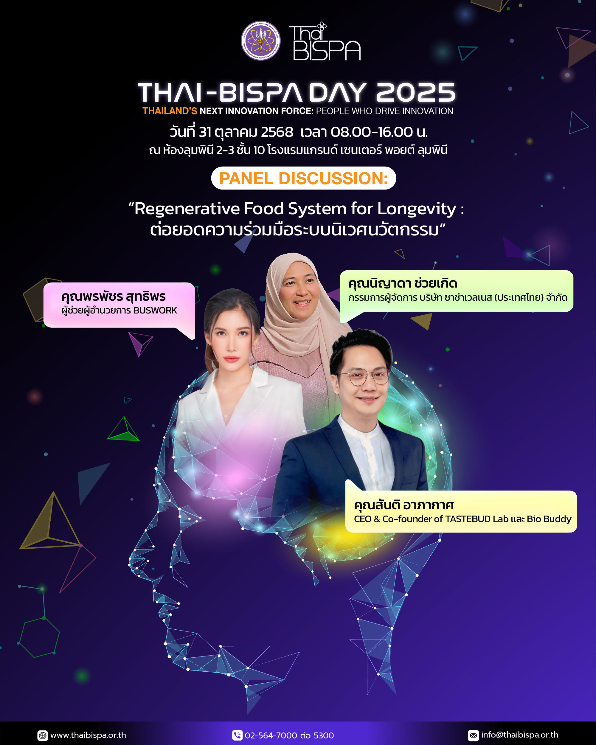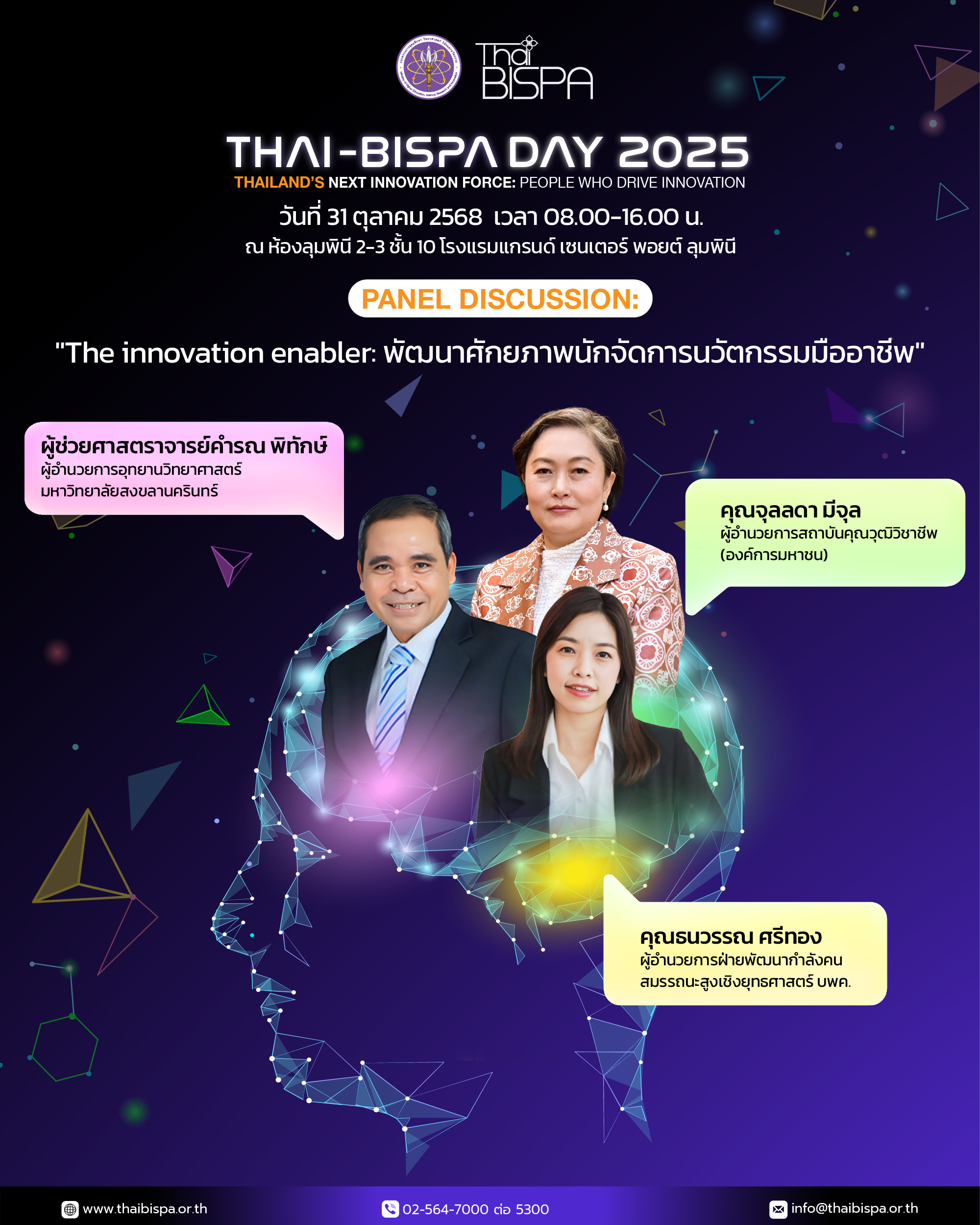 ขอเชิญทุกท่านร่วมเป็นส่วนหนึ่งภายในงานสุดยิ่งใหญ่แห่งปีกับงาน Thai-BISPA Day 2025 ปีนี้จัดขึ้นภายใต้แนวคิด “THAILAND’S NEXT INNOVATION FORCE: People Who Drive Innovation” งานรวมพลังเครือข่ายผู้ขับเคลื่อนนวัตกรรมจากทั่วประเทศที่มุ่งเน้นยกระดับศักยภาพ “คน” ในฐานะพลังสำคัญของระบบนิเวศนวัตกรรมไทย