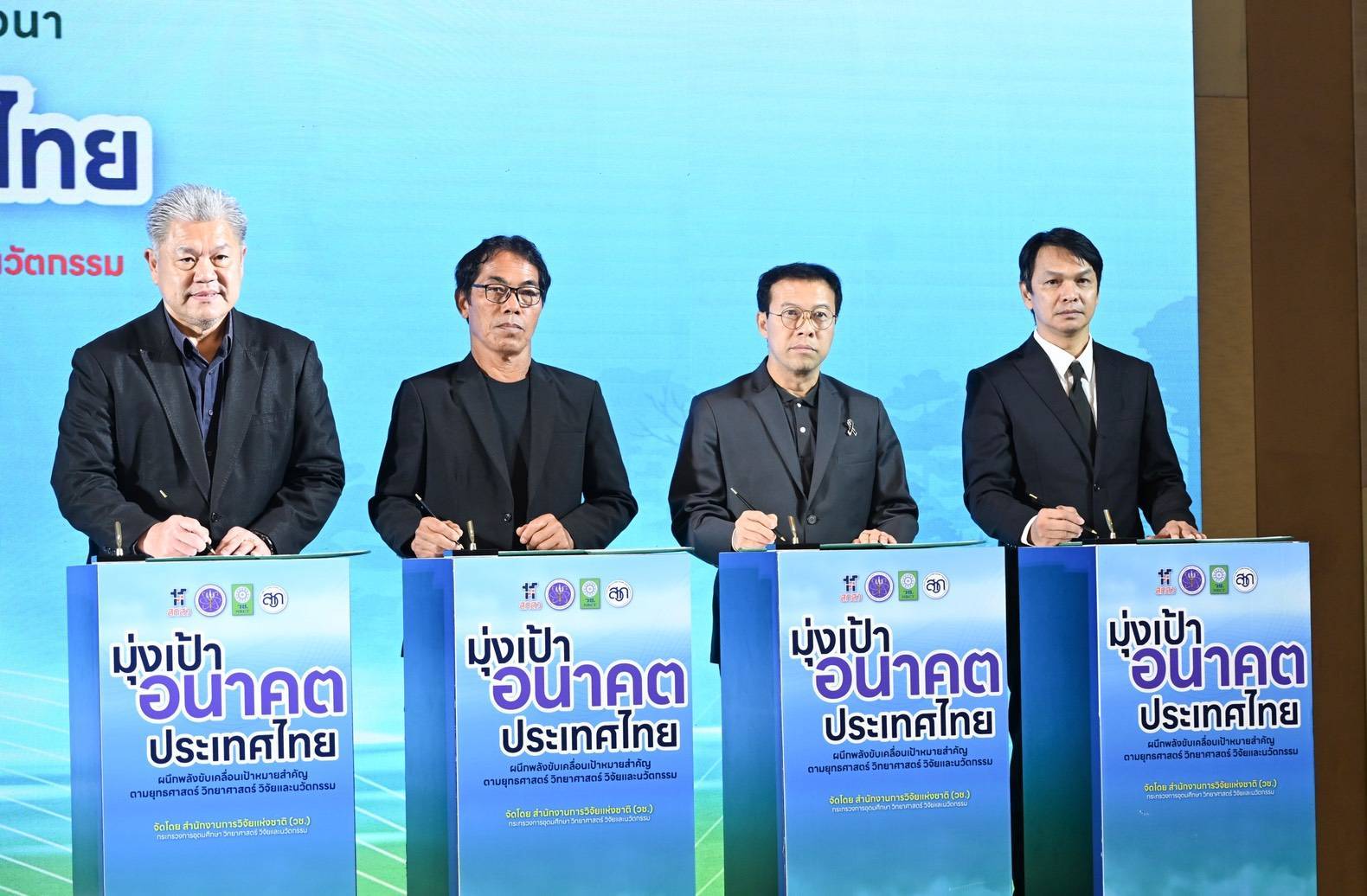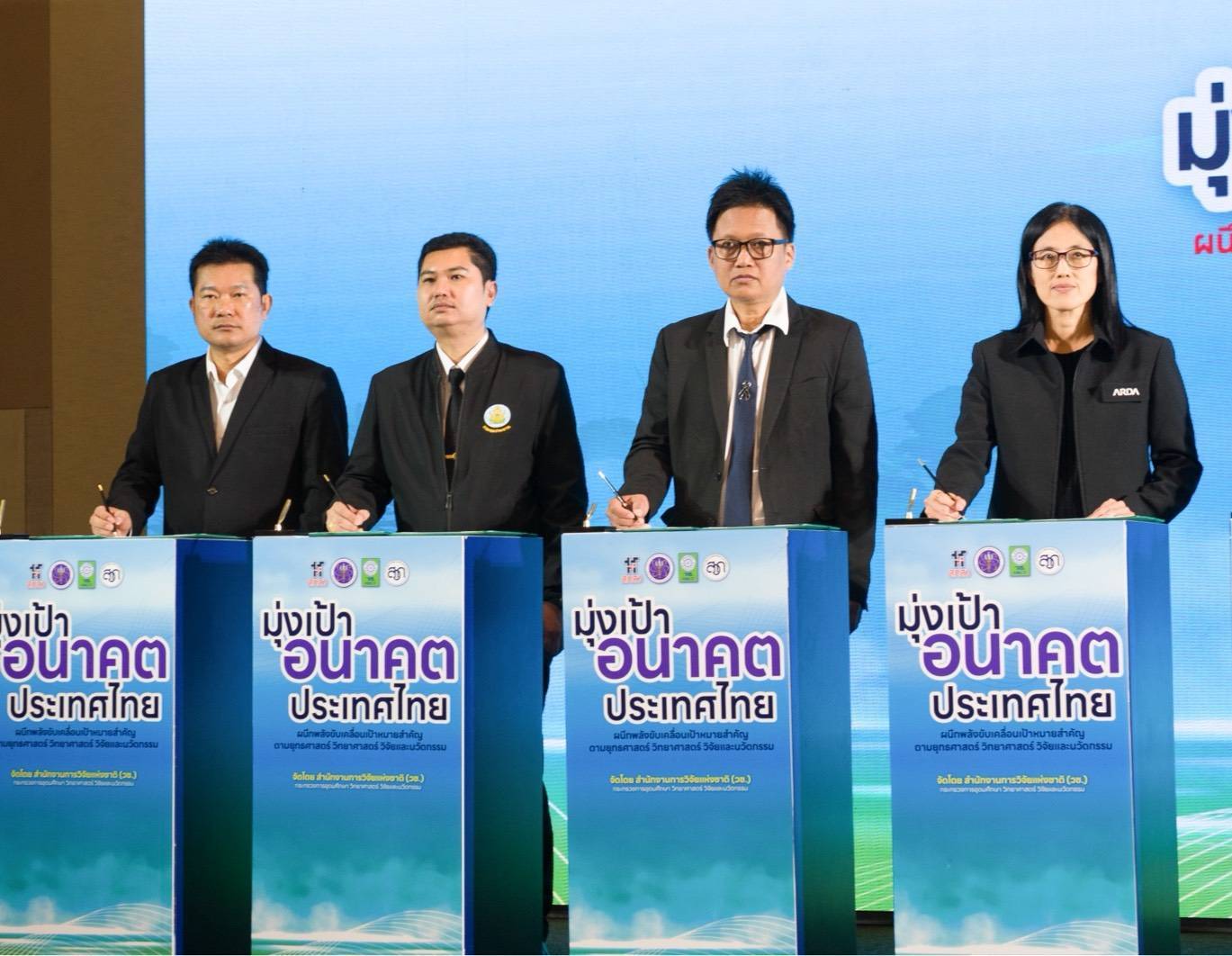 ดร.วิภารัตน์ ดีอ่อง ผู้อำนวยการสำนักงานการวิจัยแห่งชาติ กล่าวว่า วช. ภายใต้กระทรวง อว. เป็นหน่วยบริหารจัดการทุนวิจัยและนวัตกรรม ร่วมกับสำนักงานพัฒนาการวิจัยการเกษตร (องค์การมหาชน) ซึ่งเป็นหน่วยบริหารจัดการทุนด้านการเกษตร สังกัดกระทรวงเกษตรและสหกรณ์ ได้รับมอบหมายจากคณะกรรมการส่งเสริมวิทยาศาสตร์ วิจัยและนวัตกรรม (กสว.) ให้ขับเคลื่อนเป้าหมายสำคัญตามยุทธศาสตร์ ววน. ในประเด็น “น้ำมั่นคง ไม่ท่วม ไม่แล้ง ใน 10 จังหวัด” โดยนำองค์ความรู้ เทคโนโลยี และนวัตกรรมไปบูรณาการร่วมกับกลไกในพื้นที่ เพื่อให้บรรลุเป้าหมายเชิงกลยุทธ์ ได้แก่ 1. น้ำไม่ท่วม ไม่แล้ง (100 ตำบล ใน 10 จังหวัด) 2. ลดความเดือดร้อนด้านน้ำท่วม–น้ำแล้ง 120,000 ครัวเรือน 3. เพิ่มรายได้/ลดค่าใช้จ่ายจากภาครัฐ 900 ล้านบาทจังหวัดขอนแก่นเป็นหนึ่งในพื้นที่เป้าหมายสำคัญในการบริหารจัดการน้ำเพื่อความมั่นคง โดย วช. ได้ร่วมดำเนินงานกับภาคีหน่วยงานต่าง ๆ และพร้อมรับฟังความคิดเห็น เพื่อร่วมกันหาแนวทางยกระดับการแก้ไขปัญหาน้ำของจังหวัดขอนแก่นและจังหวัดชัยภูมิ ไม่ว่าจะเป็นด้านการประกันน้ำให้เพียงพอ การแก้ปัญหาภัยแล้งให้เกษตรกรพึ่งพาตนเองได้อย่างยั่งยืน การลดความเสี่ยงน้ำท่วม และการพัฒนาระบบเตือนภัย เพื่อให้ชุมชนมีความปลอดภัยมากขึ้น วช. รู้สึกเป็นเกียรติอย่างยิ่งที่ได้ร่วมลงนามบันทึกข้อตกลงความร่วมมือกับทุกหน่วยงานภาคีเครือข่ายที่มีเจตนารมณ์ร่วมกัน ร่วมเป็นส่วนหนึ่งในการแก้ปัญหาด้านน้ำของประเทศ อันเป็นจุดเริ่มต้นสำคัญในการ “มุ่งเป้าอนาคตประเทศไทยเพื่อน้ำมั่นคง ไม่ท่วม ไม่แล้ง ด้วยวิจัยและนวัตกรรม”