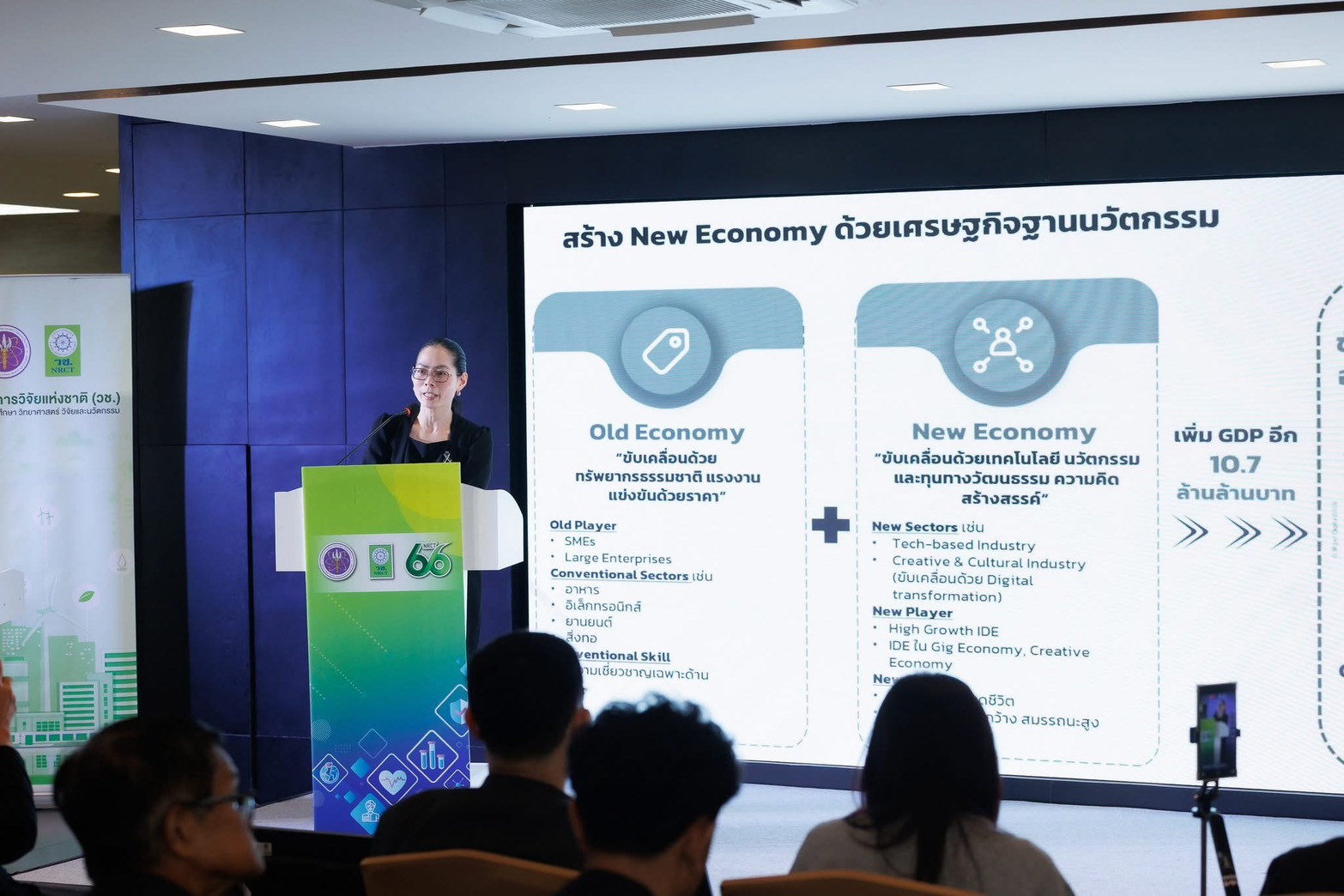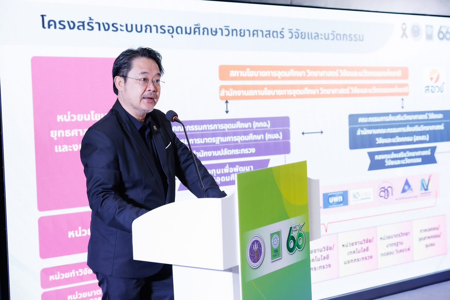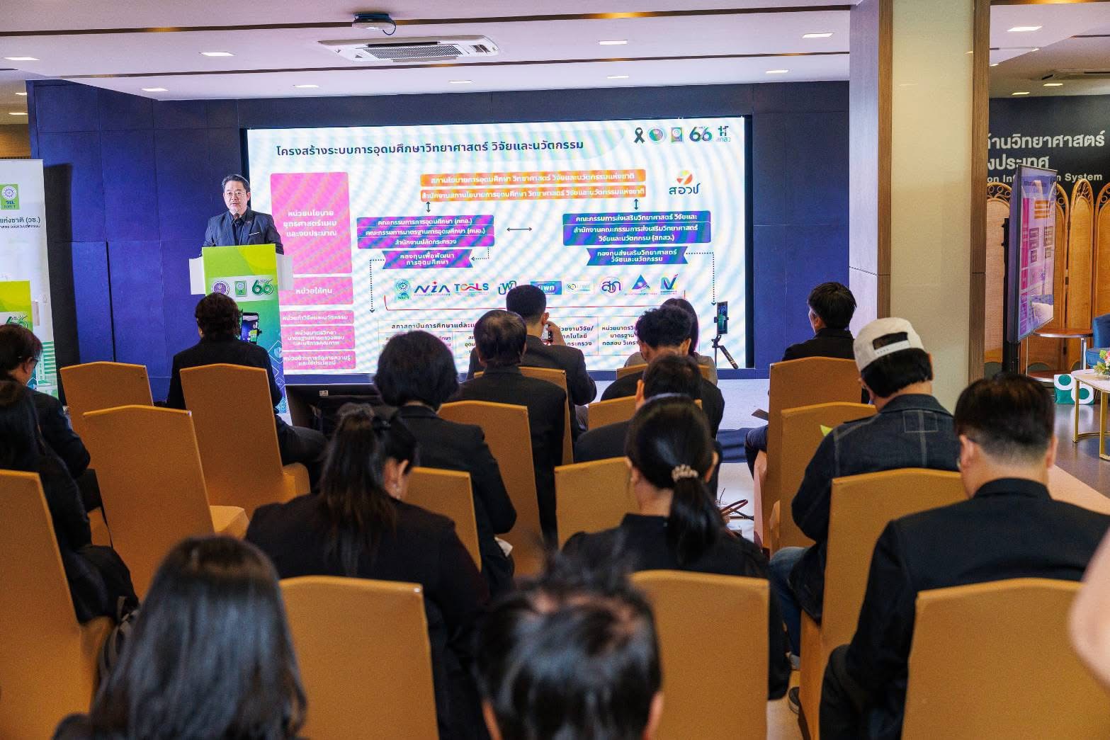 นอกจากนี้ ยังมีการเสวนานโยบายการลงทุนวิจัย เพื่อขับเคลื่อนอนาคตไทยสู่เศรษฐกิจฐานนวัตกรรม โดย ดร.สิริพร พิทยโสภณ รองผู้อำนวยการสำนักงานสภานโยบายการอุดมศึกษา วิทยาศาสตร์ วิจัยและนวัตกรรมแห่งชาติ ได้กล่าวถึง นโยบายการขับเคลื่อนประเทศสู่เศรษฐกิจฐานนวัตกรรม (Innovation-Driven Economy) โดยมีเป้าหมายคือยกระดับการพัฒนาประเทศ สร้างผู้ประกอบการฐานนวัตกรรม (IDE) และเพิ่มงบวิจัย (GERD) ผ่านมาตรการสนับสนุนและสิทธิประโยชน์ทางภาษี รศ.ดร.นพพร ลีปรีชานนท์ รองผู้อำนวยการสำนักงานคณะกรรมการส่งเสริมวิทยาศาสตร์วิจัยและนวัตกรรม กล่าวถึง แนวทางการลงทุนวิจัยและนวัตกรรมเพื่อสร้างความเข้มแข็งและยั่งยืน โดยเน้นผลักดันผลงานวิจัยสู่ SME/STARTUP/SPIN-OFF การสร้างระบบระบบนิเวศนวัตกรรม เปลี่ยนผ่านจากการให้ทุนสู่การร่วมลงทุน ผ่านมาตรการ/กลไกสำคัญ อาทิ TRIUP การจัดตั้ง University Holding Company (UHC) ให้สถาบันอุดมศึกษาสามารถนำผลงานวิจัยไปร่วมลงทุนและใช้ประโยชน์เชิงพาณิชย์ได้อย่างมีประสิทธิภาพ