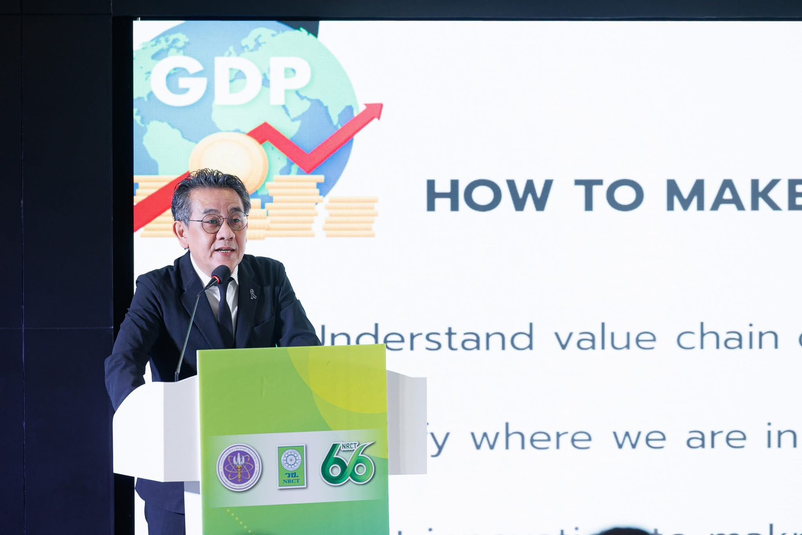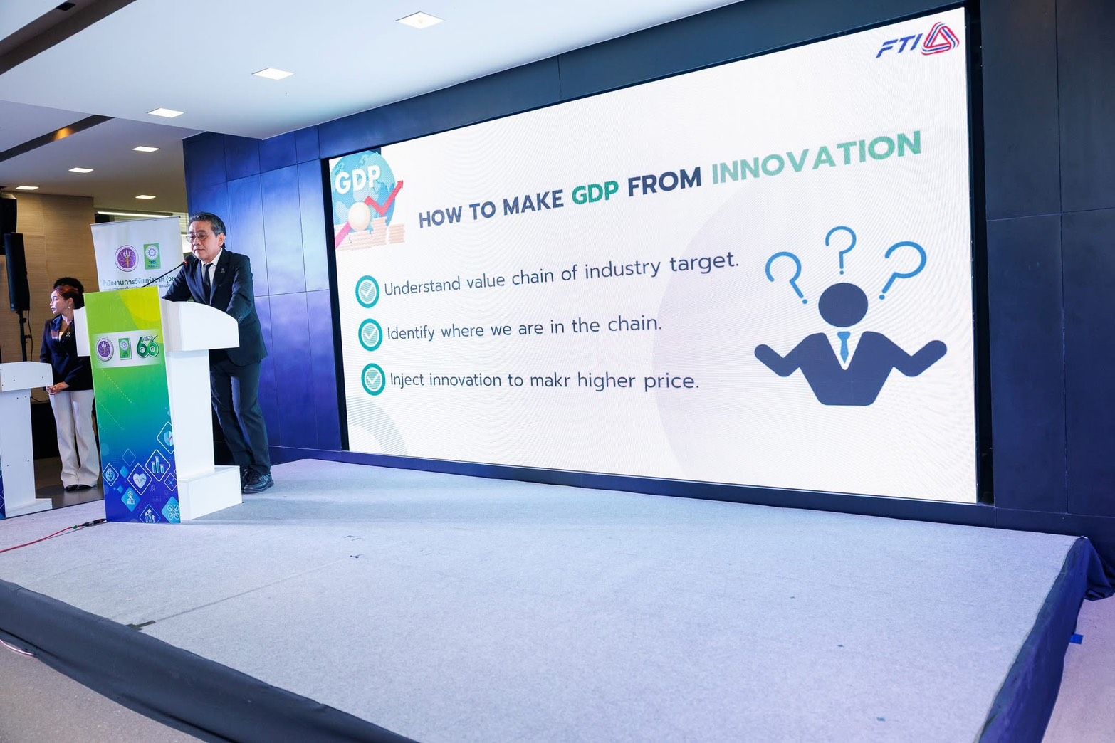 และ ดร.วิบูลย์ รักสาสน์เจริญผล รองเลขาธิการสภาอุตสาหกรรมแห่งประเทศไทย กล่าวถึง ความเชื่อมโยงระหว่างนวัตกรรมกับ GDP โดยเน้นย้ำความสำคัญของการยกระดับเทคโนโลยีจากระดับ “Incremental” เป็น “Disruptive” และกลยุทธ์การฉีดนวัตกรรมเข้าไปในห่วงโซ่คุณค่า (Value Chain) เพื่อสร้างผลิตภัณฑ์ที่มีมูลค่าและราคาสูงขึ้น