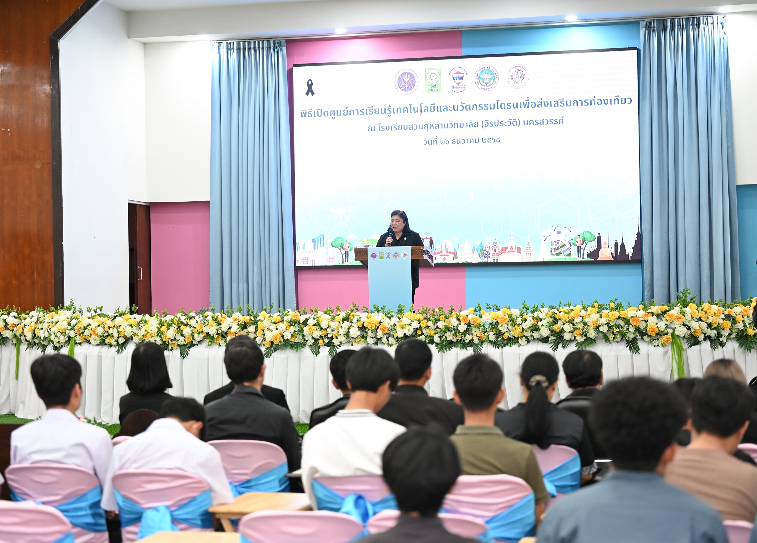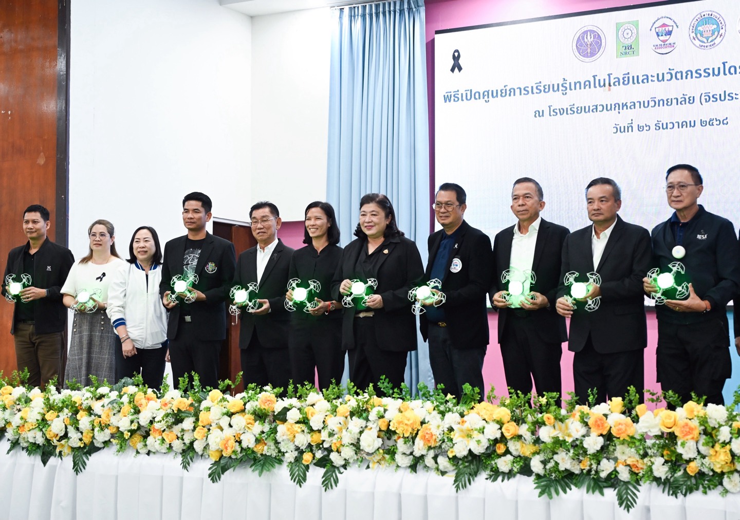 วันที่ 26 ธันวาคม 2568 สำนักงานการวิจัยแห่งชาติ(วช.) กระทรวงการอุดมศึกษา วิทยาศาสตร์ วิจัยและนวัตกรรม ร่วมกับ สมาคมกีฬาเครื่องบินจำลองและวิทยุบังคับ และ โรงเรียนสวนกุหลาบวิทยาลัย(จิรประวัติ) นครสวรรค์ จัดพิธีเปิดศูนย์การเรียนรู้เทคโนโลยีและนวัตกรรมโดรนเพื่อส่งเสริมการท่องเที่ยว โดยมี ดร.วิภารัตน์ ดีอ่อง ผู้อำนวยการสำนักงานการวิจัยแห่งชาติ เป็นประธานในพิธีเปิด พร้อมด้วย นางสาวพวงเพ็ชร สุขจิตร์ ผู้อำนวยการกองการศึกษา ศาสนา และวัฒนธรรม องค์การบริหารส่วนจังหวัดนครสวรรค์ กล่าวแสดงความยินดีและกล่าวต้อนรับ และนายพิศิษฐ์ มิตรเกื้อกูล นายกสมาคมกีฬาเครื่องบินจำลองและวิทยุบังคับ กล่าวรายงานที่มาของโครงการ ณ โรงเรียนสวนกุหลาบวิทยาลัย (จิรประวัติ) นครสวรรค์