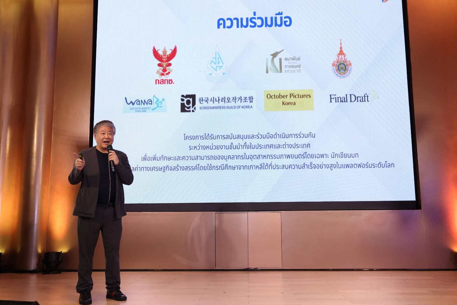โดยมีผู้สนับสนุนหลักคือ กสทช ได้เล็งเห็นถึงการทำโครงการพิเศษ ซึ่งไม่ซ้ำรูปแบบเดิม คือการสอนเขียนบท แต่เป็นการนำไอเดียที่มีอยู่ของนักเขียนหรือ นักสร้างสรรค์แต่ละคน นำมาปรับปรุง พัฒนา ให้มีความเป็นสากลมากยิ่งขึ้น โดยครั้งนี้จะเป็นการนำไอเดียของผู้เข้าอบรม ที่ผ่านกา คัดเลือกจำนวน 60 เรื่อง จะได้รับซอฟต์แวร์ final draft เป็นระยะเวลา 1 ปี จากนั้นทีมผู้เชี่ยวชาญจาก สถาบันนักเขียนบทมืออาชีพของประเทศเกาหลี (Screenwriters Guild of Korea) จะคัดเลือกรอบสุดท้ายที่จะะได้เวิร์คช็อปกับผู้เชี่ยวชาญจากสถาบันนักเขียนบทมืออาชีพ ของประเทศ เกาหลี เพื่อช่วยยกระดับทักษะการเขียนบทของนักเขียนไทยอย่างเป็นระบบและนำไปสู่การสร้างผลงานภาพยนตร์ และซีรีส์ไทยที่มีคุณภาพ พร้อมก้าวสู่ตลาดสากลครับ