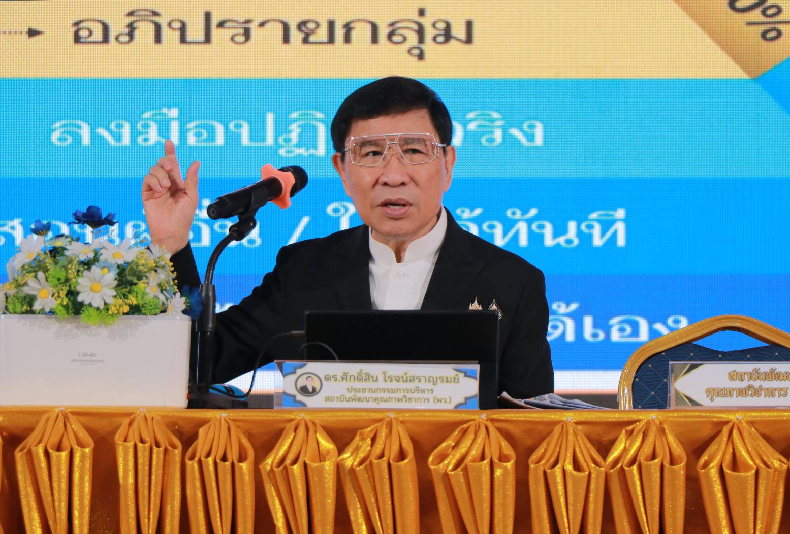 ด้าน ดร.ศักดิ์สิน โรจน์สราญรมย์ ประธานกรรมการบริหารสถาบันพัฒนาคุณภาพวิชาการ (พว.)อดีตกรรมการปฏิรูปประเทศด้านการศึกษา กล่าวว่า จากการศึกษาและวิจัยของทางสถาบันฯ รวมถึงการได้ไปศึกษาดูงานการศึกษาของประเทศต่าง ๆ ทั่วโลก ทำให้เข้าใจอย่างชัดเจนว่า การที่จะสามารถพลิกโฉมคุณภาพการศึกษาไทยได้นั้น จะต้องทำร่วมกันแบบองค์รวม อาศัยกระบวนการพัฒนานวัตกรรมของครูผู้สอน เพื่อนำสู่การสร้างนวัตกรรมของผู้เรียน ผ่านการปรับเปลี่ยนการเรียนการสอนที่เน้นผู้เรียนเป็นสำคัญ (Active Learning) ควบคู่กับการจัดการเรียนรู้ที่พัฒนาสมรรถนะของผู้เรียน ด้วยกระบวนการคิดขั้นสูงเชิงระบบ GPAS 5 Steps ภายใต้หลักสูตรอิงมาตรฐานของกระทรวงศึกษาธิการ เมื่อดำเนินการดังนี้แล้วผู้เรียนจึงจะเกิดผลการเรียนรู้ จากการลงมือทำเป็นผลงาน และนวัตกรรม จนเกิดความคิดรวบยอดสามารถนำหลักการไปใช้ในทุกกลุ่มสาระการเรียนรู้ และด้วยกระบวนการเรียนรู้เดียวกัน ที่สามารถนำไปใช้เรียนรู้เรื่องต่าง ๆ ได้ในชีวิต ที่สำคัญแนวคิดและหลักการนี้สามารถทำได้จริง ซึ่งผมได้พิสูจน์มาแล้ว โดยใช้เวลา 3 ปีการศึกษา ที่โรงเรียนดรุณาราชบุรีแห่งนี้ ซึ่งทีมผู้บริหารโรงเรียนได้เปิดใจและร่วมมืออย่างเต็มที่ จนทำให้โรงเรียนดรุณาราชบุรีกลายเป็นโรงเรียนต้นแบบการจัดการเรียนรู้แบบ Active Learning ด้วยกระบวนการคิดขั้นสูงเชิงระบบ GPAS 5 Steps