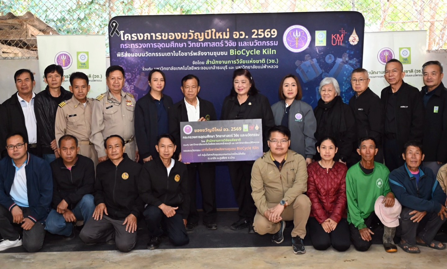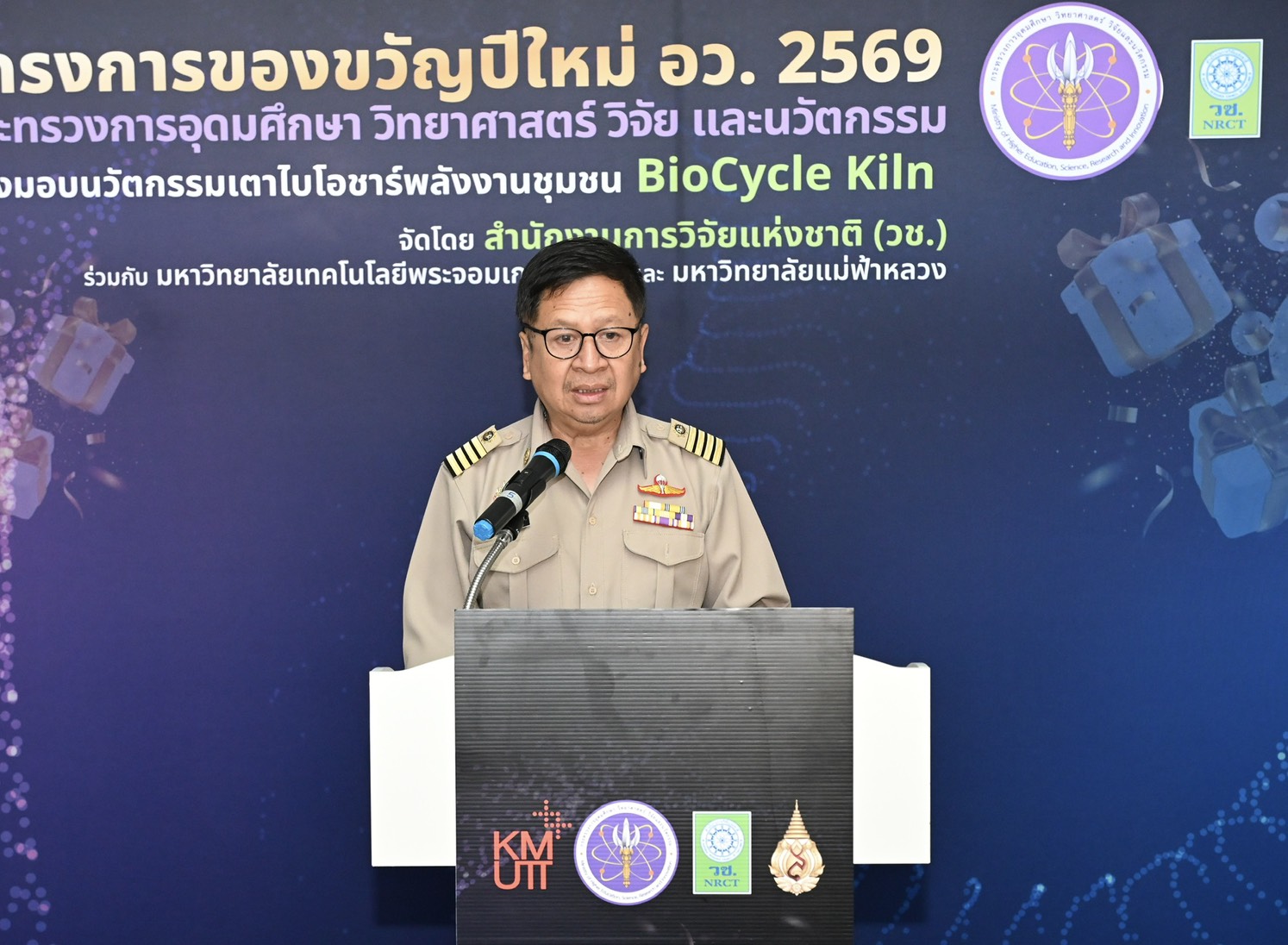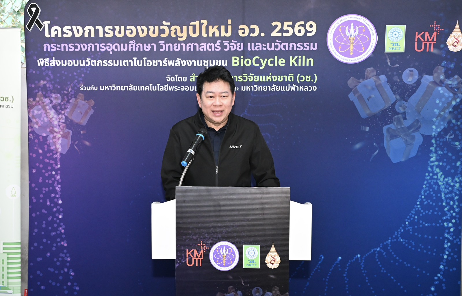 ดร.วิภารัตน์ ดีอ่อง ผู้อำนวยการสำนักงานการวิจัยแห่งชาติ กล่าวว่า อว.ได้ดำเนินโครงการของขวัญปีใหม่ พ.ศ. 2569 โดย วช. ร่วมขับเคลื่อนการนำนวัตกรรมไปใช้ประโยชน์ในระดับพื้นที่ ผ่านนวัตกรรมเตาไบโอชาร์พลังงานชุมชน BioCycle Kiln ซึ่งพัฒนาขึ้นจากความร่วมมือระหว่างมหาวิทยาลัยเทคโนโลยีพระจอมเกล้าธนบุรี และมหาวิทยาลัยแม่ฟ้าหลวง พร้อมทั้งถ่ายทอดองค์ความรู้ด้านการใช้งานให้แก่ชุมชนอย่างเป็นระบบ เพื่อให้สามารถนำเทคโนโลยีไปประยุกต์ใช้ในการจัดการเศษวัสดุเหลือทิ้งทางการเกษตรได้อย่างมีประสิทธิภาพ ช่วยลดปัญหามลพิษฝุ่นละอองขนาดเล็ก PM2.5 และส่งเสริมการพึ่งพาตนเองด้านเทคโนโลยีของชุมชน ตลอดจนต่อยอดการใช้ประโยชน์ในมิติทางเศรษฐกิจและสิ่งแวดล้อม อันจะนำไปสู่การยกระดับคุณภาพชีวิตของประชาชนและเสริมสร้างความเข้มแข็งให้กับชุมชน