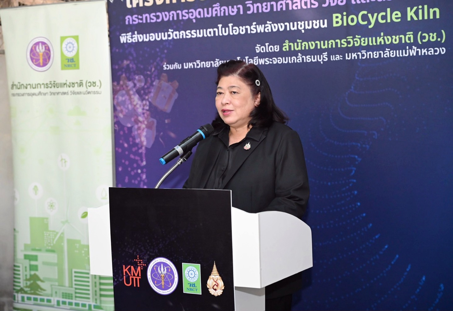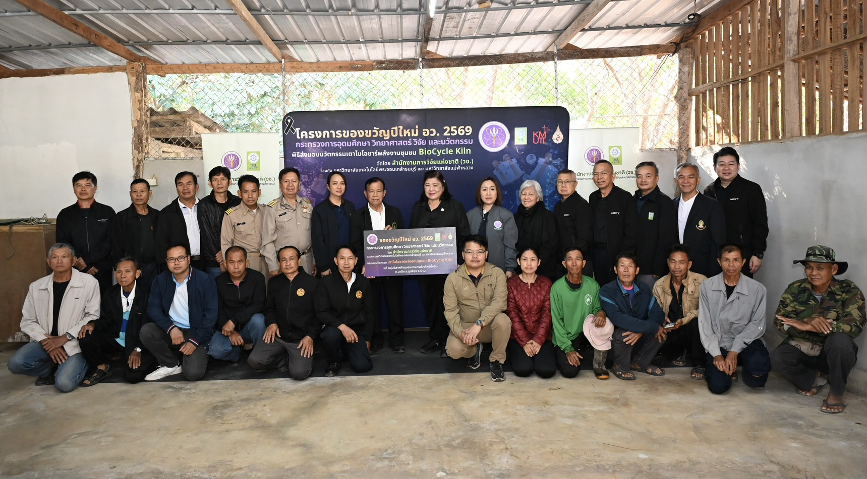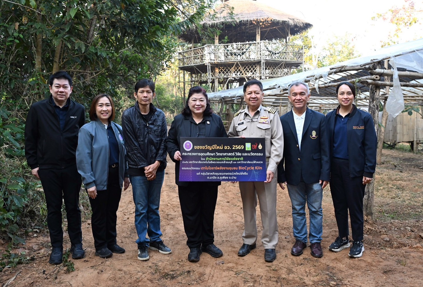 ดร.วิภารัตน์ ดีอ่อง ผู้อำนวยการสำนักงานการวิจัยแห่งชาติ กล่าวว่า อว.ได้ดำเนินโครงการของขวัญปีใหม่ พ.ศ. 2569 โดย วช. ร่วมขับเคลื่อนการนำนวัตกรรมไปใช้ประโยชน์ในระดับพื้นที่ ผ่านนวัตกรรมเตาไบโอชาร์พลังงานชุมชน BioCycle Kiln ซึ่งพัฒนาขึ้นจากความร่วมมือระหว่างมหาวิทยาลัยเทคโนโลยีพระจอมเกล้าธนบุรี และมหาวิทยาลัยแม่ฟ้าหลวง พร้อมทั้งถ่ายทอดองค์ความรู้ด้านการใช้งานให้แก่ชุมชนอย่างเป็นระบบ เพื่อให้สามารถนำเทคโนโลยีไปประยุกต์ใช้ในการจัดการเศษวัสดุเหลือทิ้งทางการเกษตรได้อย่างมีประสิทธิภาพ ช่วยลดปัญหามลพิษฝุ่นละอองขนาดเล็ก PM2.5 และส่งเสริมการพึ่งพาตนเองด้านเทคโนโลยีของชุมชน ตลอดจนต่อยอดการใช้ประโยชน์ในมิติทางเศรษฐกิจและสิ่งแวดล้อม อันจะนำไปสู่การยกระดับคุณภาพชีวิตของประชาชนและเสริมสร้างความเข้มแข็งให้กับชุมชน