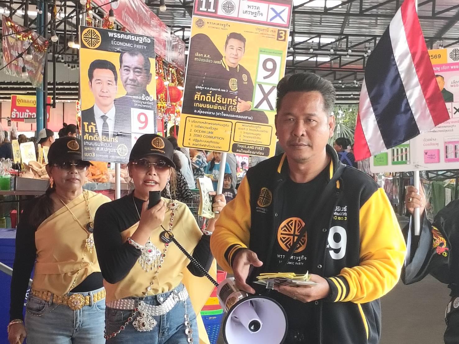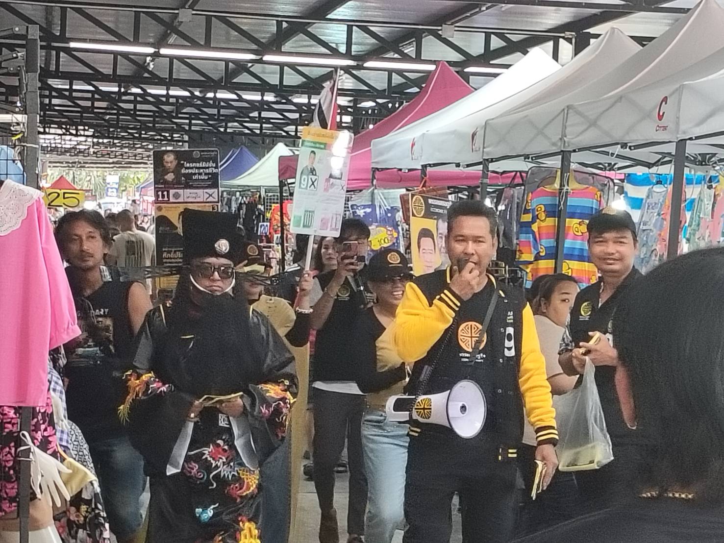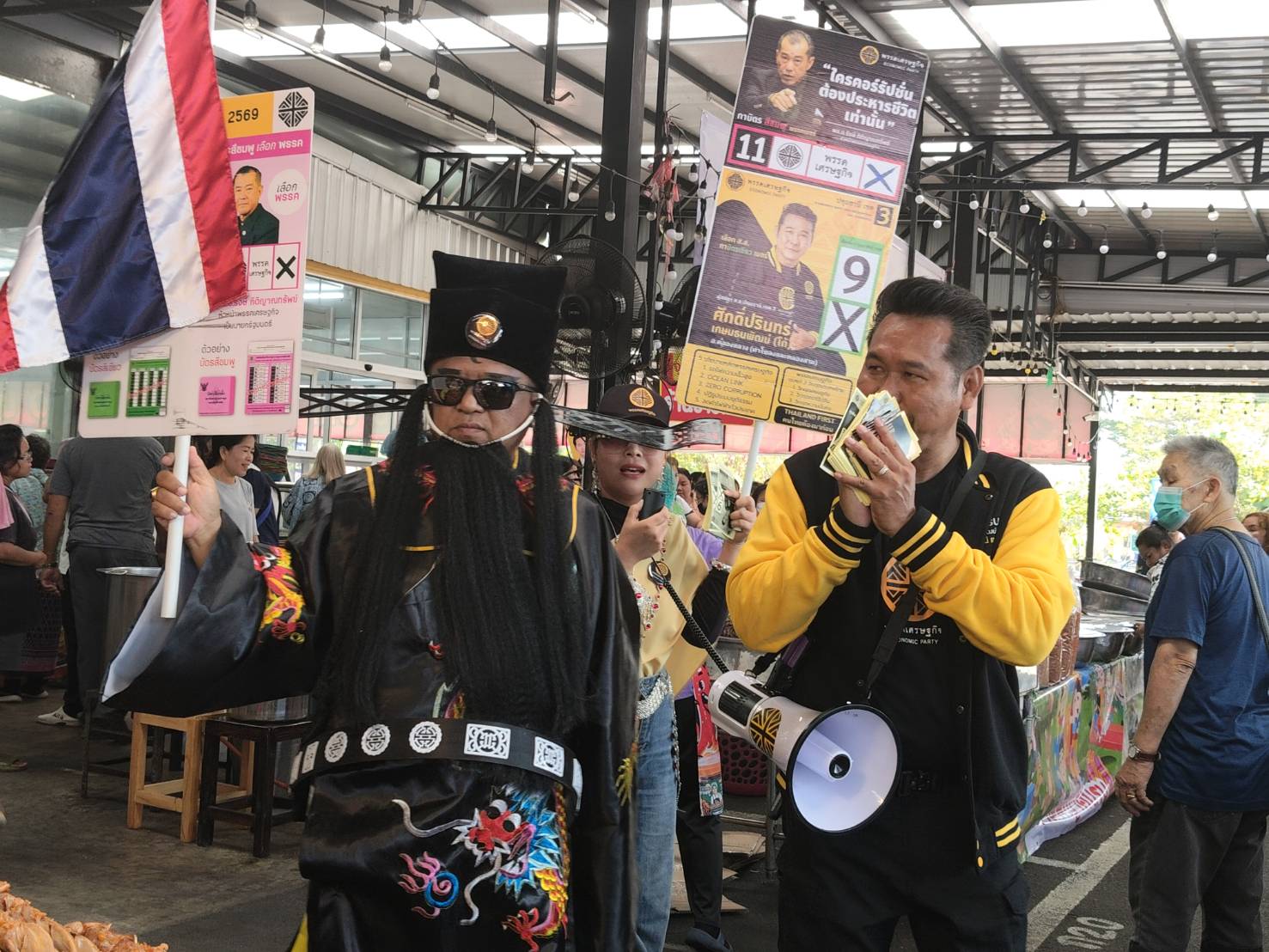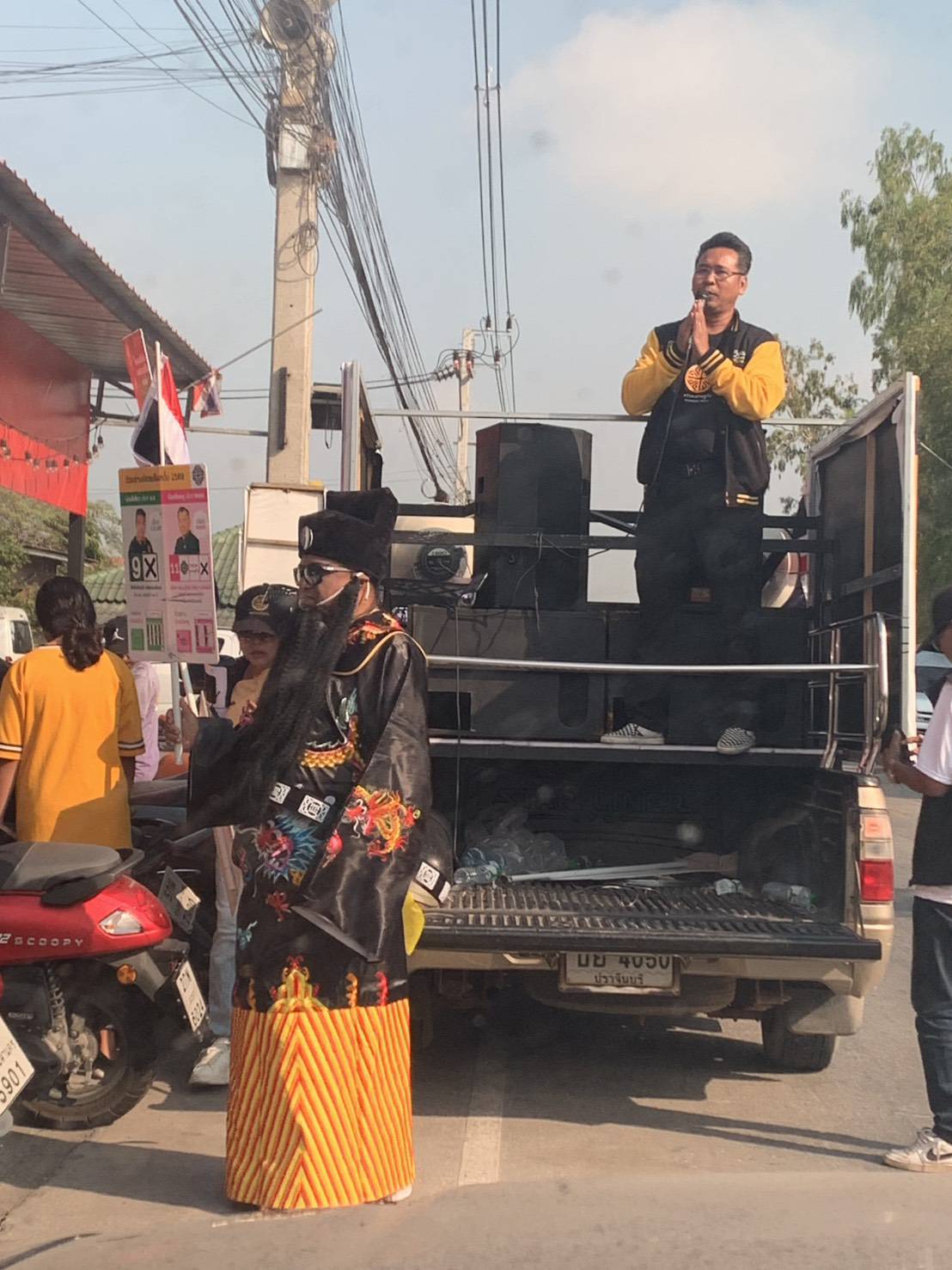 ผู้สมัคร ส.ส.ปทุมธานี เขต 3 พรรคเศรษฐกิจ เบอร์ 9 นำทีมผู้ช่วยหาเสียง แต่งชุด “เปาปุ้นจิ้น” และ สไบไทย ลงพื้นที่หาเสียงโค้งสุดท้าย ที่ ตลาดพี่ญาคนรุม ปากซอย 13/3 ต.คลองสาม อ.คลองหลวง จ.ปทุมธานี