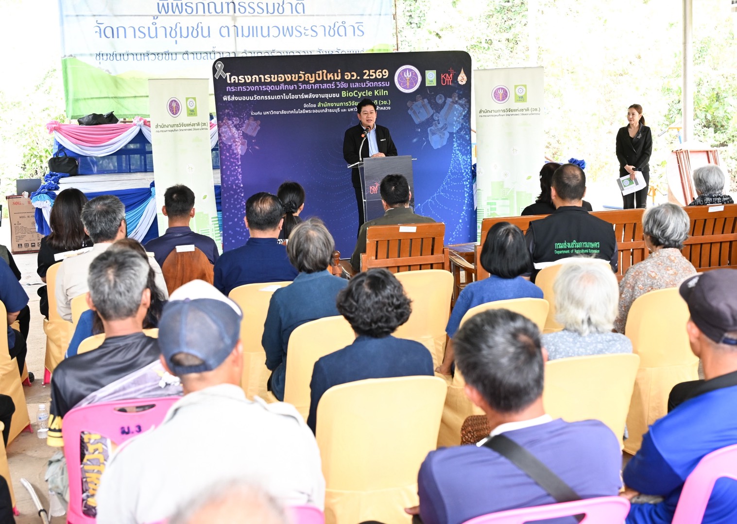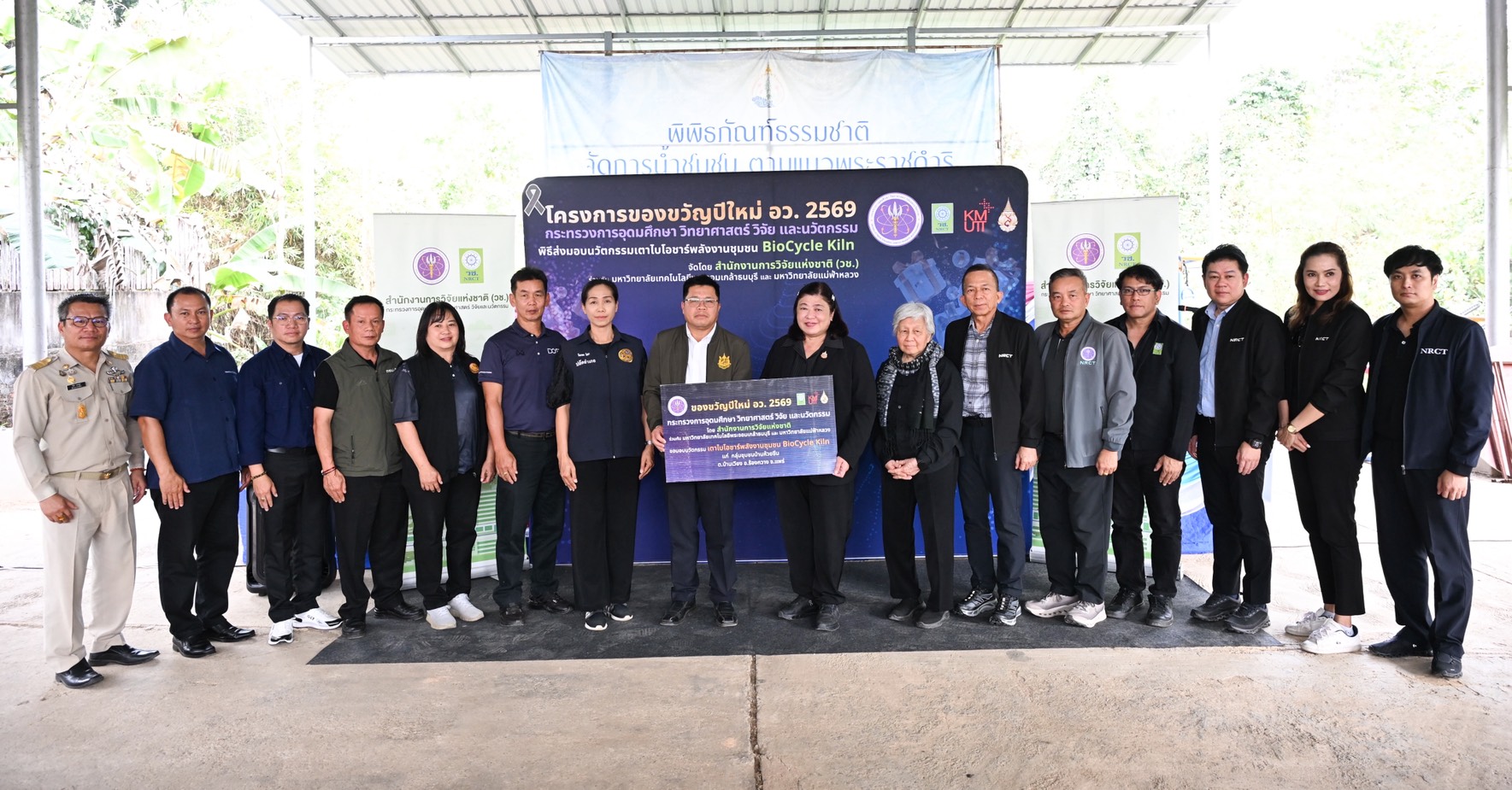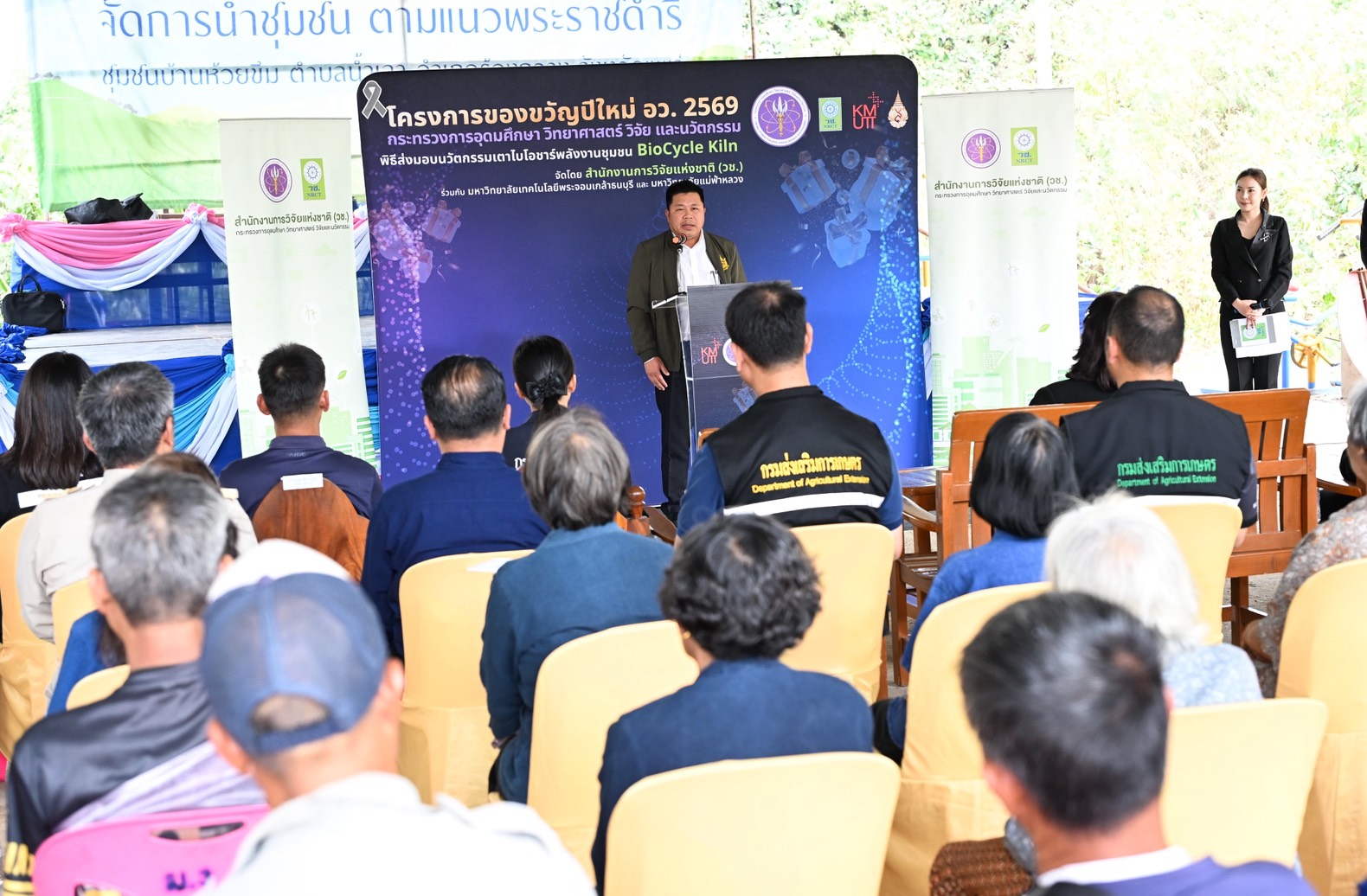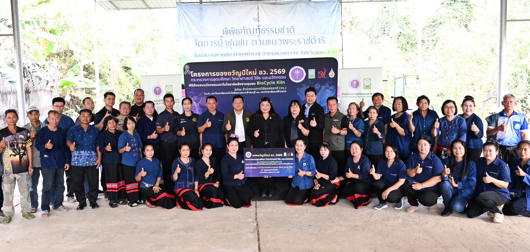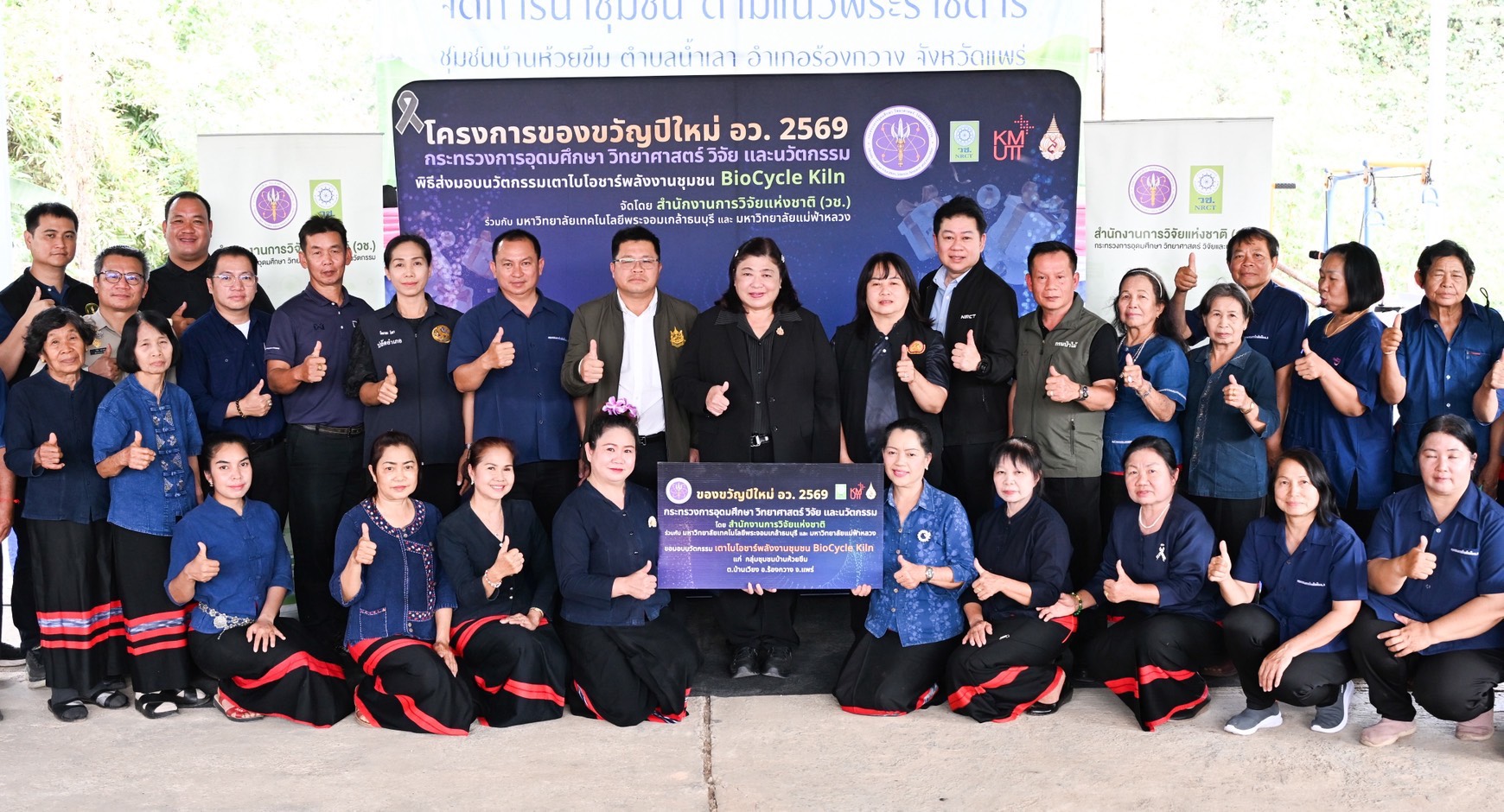 วันที่ 9 กุมภาพันธ์ 2569 สำนักงานการวิจัยแห่งชาติ(วช.) กระทรวงการอุดมศึกษา วิทยาศาสตร์ วิจัยและนวัตกรรมจัด “พิธีส่งมอบนวัตกรรมเตาไบโอชาร์พลังงานชุมชน BioCycle Kiln” ภายใต้โครงการของขวัญปีใหม่ อว. 2569 โดยมี ดร.วิภารัตน์ ดีอ่อง ผู้อำนวยการสำนักงานการวิจัยแห่งชาติ เป็นประธานในการส่งมอบ พร้อมด้วย รองศาสตราจารย์ ดร.อนรรฆ ขันธะชวนะ มหาวิทยาลัยเทคโนโลยีพระจอมเกล้าธนบุรีหัวหน้าโครงการ กล่าวรายงาน นายธนรัตน์ แปงใจ ผู้อำนวยการสำนักจัดการทรัพยากรป่าไม้ที่ 3 สาขาแพร่ กล่าวต้อนรับ และคณะผู้ทรงคุณวุฒิ วช. เข้าร่วมพิธี ณ บ้านห้วยขึม ต.น้ำเลา อ.ร้องกวาง จ.แพร่